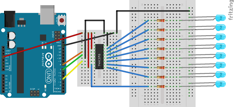 I had this little project in mind but after chewing on it for a while I figured that to achieve my goal I would need more pins than the Arduino Uno can offer. I started looking at what my options were and soon I found something that looked very promising – shift registers (yes, I realize that this is a very basic stuff for people familiar with elementary electronics but sadly I am not one of them). Conceptually, the way shift registers work is simple – you feed a shift register bit by bit (serial-in) and then tell it to output all data at once (parallel-out). (The opposite (i.e. parallel in, serial out) is also possible but this is out of scope of this post.) Translating this to Arduino terms – with one output pin to send the data and a couple of additional output pins to control the shift register we can have tens of output pins. In the simplest case “tens” means actually 8 but shift registers can be cascaded and each additional register adds 8 additional output pins. To try this out I got myself a few 74HC595 shift registers and a bunch of LEDs and resitors and build this circuit:
