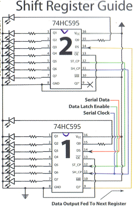 One thing that turned out to be very helpful was a small sheet I got when I bought the shift registers showing how to cascade them. Even though I was not cascading shift registers (I was too cheap and bought just 10 LEDs) it helped me connect all the power and ground wires to the correct pins. I actually decided to scan the sheet and attach it to this post because I am sure I will lose it sooner than later and won’t be able to find it when I need it. Here it is:
